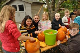 Nun konnte es so richtig losgehen! Erst mal einen Deckel abschneiden und die Frucht aushöhlen. Ganz schön anstrengend, bis alle Fasern und Kerne entfernt sind! Dann ein Gesicht aufzeichnen: Soll es freundlich oder lustig aussehen oder doch eher gruselig? Ein Blick zum Nachbarn kann da helfen! Mit verschiedenen Messern und speziellen Sägen ging es ans Ausschneiden der Motive. Dazu war Konzentration und Vorsicht, manchmal auch die Hilfe der Erwachsenen, nötig. Selbst ein kurzer Regenschauer konnte die Kinder in ihrem Arbeitseifer nicht bremsen.