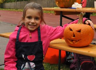 Etwa 50 Kinder, teilweise mit ihren Eltern, kamen in den Pausenhof der Grundschule. Der Andrang war so groß, dass die bereitgestellten Kürbisse nicht ausreichten und noch schnell welche besorgt werden mussten. Groß oder klein, länglich oder doch eher rund? Bald hatte jedes Kind seinen Lieblingskürbis gefunden und einen Platz an den Arbeitstischen belegt.
