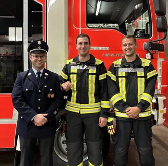 Kommandant Christian Steiner (links) sowie stv. Kommandant Simon Strempfl (rechts) gratulierten Markus Steigleder zum höchsten Leistungsabzeichen der Stufe Gold/Rot.
