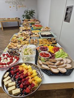 Dabei waren der Kreativität und dem Einfallsreichtum der Eltern schier keine Grenzen gesetzt. Bei der Auswahl an Obstspießen, Mini-Gugelhupf, Muffin, Rohkostplatten, Pizzaschnecken, Sandwiches, Käsewindbeuteln und vielem, vielem mehr, konnten sich die Kinder kaum entscheiden. Zum Glück konnten die Brotzeitdosen mehr wie einmal gefüllt werden, sodass alle Kinder sich ausführlich durch das Angebot probieren konnten.
