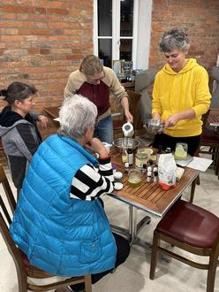 Als Höhepunkt des Abends versammelten sich alle um einen Tisch mit Zutaten und Tiegeln, in denen alle gemeinsam ein Gesichtspeeling und zwei Hautcremes herstellten. Jede konnte fühlen und riechen, wie sich die verschiedenen Zutaten auf das Endprodukt auswirken.