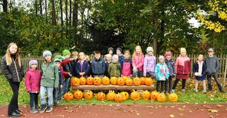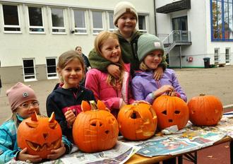 Nachdem jedes Kind einen Kürbis ausgesucht hatte, ging es an´s Werkeln. Mit Unterstützung vieler Eltern oder Großeltern wurden tolle Gesichter und Köpfe geschaffen. Es entstanden lustige, lachende, gruselige und schaurige Kürbislaternen, die stolz nach Hause getragen wurden.