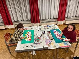 Was ist meine Lieblingsfarbe? Welche Farbe setze ich neben das leuchtende Rot? Wie geht es mir mit diesem knalligen Blau? Unter Anleitung von Gabi Jakob durften wir in den verschiedensten Farben schwelgen und ein buntes Bild gestalten, dessen Deutung sich nach der Phantasie des Betrachters richtet. Nebenbei gab es noch Kaffee, selbstgemachte Spekulatius und gute Gespräche. Vielen Dank für diese entspannende Auszeit, nächstes Mal sind wir wieder dabei – sagen die Malerinnen, die eigentlich nicht malen können und sich doch über das schöne Ergebnis freuten.