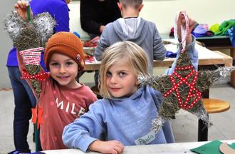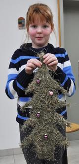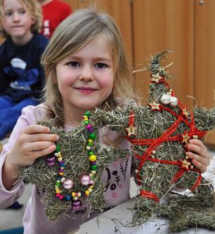 Dort hatten die Betreuer/-innen schon alles vorbereitet: Aus Karton ausgeschnittene weihnachtliche Motive, Heu, allerlei Deko-Material und Werkzeug. Schnell hatte sich jedes Kind für eine Figur entschieden. Diese musste nun mit dem Heu umwickelt werden. Viel Draht oder Faden, eine Menge Geduld und manchmal auch Hilfe der Erwachsenen waren dazu nötig. Aber bald waren alle Sterne, Monde, Bäumchen und Herzen gut verpackt. Nun ging es ans Verzieren und die Kinder konnten aus dem vielfältigen Angebot an Bändern, Kugeln, Ketten und Perlen auswählen. Mit großem Eifer setzten die Kinder ihre kreativen Ideen um.