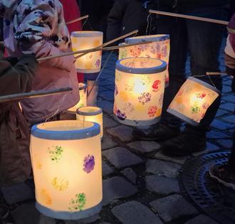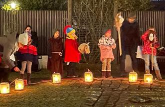 Der Vorplatz der Kirche wurde bereits durch das brennende Martinsfeuer und den Lichterketten erhellt.