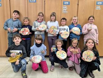 Dabei gestalteten die Kinder ein ganz besonderes Spielbrett für „Mensch ärgere dich nicht“ – und zwar nicht auf Karton oder Papier, sondern auf schönen Baumscheiben, die im Vorfeld vom Verein organisiert wurden. Akkurat und auch kreativ wurde das Spielfeld auf die Holzscheiben gezeichnet. Dann wurden Spielfiguren gestaltet, die ebenso aus Naturmaterialien entstehen sollten; und zwar aus Eichelhütchen, die die Kinder bereits im Herbst selbst gesammelt hatten. Mit etwas Farbe und Bastelglitzer entstanden daraus kleine, funkelnde Eicheljuwelen, die jeden Spielzug zum kleinen Highlight machen.