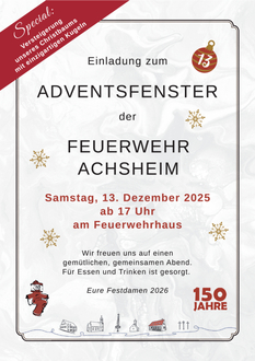 Auch in diesem Jahr gestalten die Festdamen 2026 im Rahmen des Achsheimer Adventsfensters wieder die Eingangstüre des Feuerwehrhauses, um es Euch am Samstag dem 13.12.2025 ab 17 Uhr zu präsentieren.