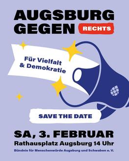 Das Bündnis für Menschenwürde Augsburg und Schwaben e. V. ruft im breiten Zusammenschluss mit der Zivilgesellschaft zur Kundgebung „Augsburg gegen Rechts – für Vielfalt und Demokratie“ am Samstag, 3. Februar 2024, um 14.00 Uhr auf dem Rathausplatz in Augsburg auf.