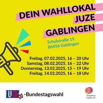 Vom 07.02. bis 14.02.2025 kannst du im Gaby Juze vorbeikommen und deine Stimme für die Bundestagswahl abgeben. Das Juze dient als Wahllokal mit Stimmzettel und Wahlurne. Mit dieser deutschlandweiten Wahlsimulation bekommen Kinder und Jugendliche eine Möglichkeit, ihre politische Meinung kundzutun. Die vollständigen Wahlergebnisse sind am 17.02 online zu finden.
