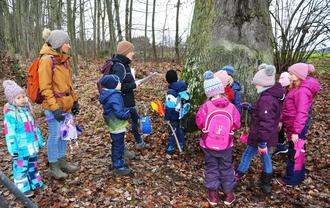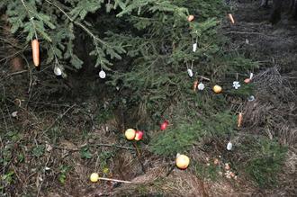 Vor einem Tannenwäldchen machte die Gruppe halt, es wurde eine Geschichte von den Tieren im Wald vorgelesen und mitgebrachtes Obst und Gemüse ausgepackt. Die Betreuer hatten die Früchte vor der Mülltonne bewahrt und präpariert für die Waldtiere. Karotten wurden am Tannenbaum aufgehängt, sowie Äpfel an Ästen aufgespießt und in den Boden gesteckt. Nüsse wurden unter den Baum gelegt und eigens für die Tiere gefertigte Vogelfutter-Muffins an die Äste gehängt.