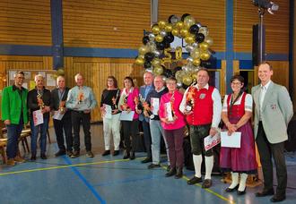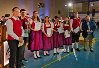 Sebastian Bernhard vom ASM ehrte für ihre langjährige aktive Mitwirkung Kilian Kranzfelder (10 Jahre), Elisabeth Frede (15 Jahre), Petra Breitfelder (25 Jahre) und Petra Pecher (50 Jahre). Zudem erhielten Nicola Zimmermann und Lukas Schalk für ihre erfolgreich bestandene Leistungsprüfung D1 eine Urkunde und die begehrte Anstecknadel.