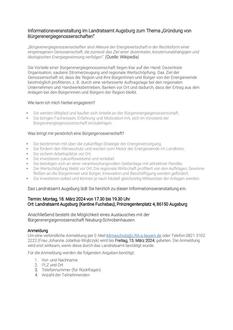 Um eine verbindliche Anmeldung per E-Mail klimaschutz@LRA-a.bayern.de oder Telefon 0821 3102 2222 (Frau Johanna Jobelius-Wojtczyk) wird bis Freitag, 15. März 2024, gebeten. Die Anmeldung wird erst wirksam, wenn diese durch das Landratsamt bestätigt wurde.