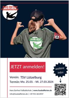 In den Osterferien haben junge Kicker im Alter von 6 bis 14 Jahren die Möglichkeit, auf dem Sportgelände des TSV Lützelburg an ihrer Fußballtechnik zu feilen und dabei jede Menge Spaß zu haben. Egal ob Dribbelkünstler, Anfänger, Vereinsspieler oder begeisterter Hobbykicker - die Hans Dorfner Fußballschule bietet in den Osterferien vom 25.03. - 27.03.24 ein unvergessliches Fußballerlebnis.