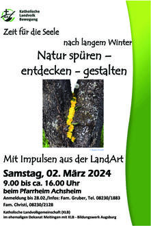 Dazu laden wir wieder herzlich ein: einen Tag Auszeit für sich zu nehmen - nach Töpfern und kreativem Nähen - heuer wieder wie schon 2019 mit Impulsen aus der LandArt - einer Kunstrichtung, die zur Wahrnehmung in der Natur einlädt und aus dort entdeckten Materialien Kunstwerke schafft. Die Sinne jeder/s Einzelnen zählen, in kreativem Zusammenwerkeln soll ein gemeinsames Kunstwerk entstehen.