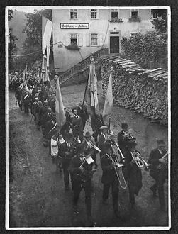 Am Abend versammelte sich die Gemeinde vor dem Pfarrhaus zu einer Abendkundgebung. Hoch vom Turm erstrahlten in der Dunkelheit der Nacht durch das Saaletal ein glänzendes Kreuz und die Jubelzahl 100.
