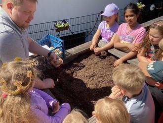 Gemeinsam mit dem erfahrenen Kartoffelbauern Lorenz Höfler aus Höllrich haben die Schulkinder der 2. Klasse und 3. Klasse zwei große Hochbeete mit Kartoffeln bepflanzt.