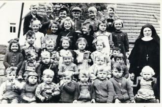 Christian (1900-1976) und Ferdinand Gerlach (1903-1993) waren die Eigentümer des Besitzes HsNr. 66. Der Mangel an anspruchsvoller Arbeit im Saaletal veranlasste die Brüder ihren Wohnsitz nach Frankfurt a. M. zu verlegen. Sie vermieteten ihr Anwesen. Mit der katholischen Kirchengemeinde schlossen sie einen Nutzungsvertrag für einen Kindergarten. Für diesen Zweck nahm sie das Untergeschoss in Anspruch. Ab 1.12.1945 drangen Kinderstimmen aus der ehemaligen Bauernstube. Schwester Cornelis, mit bürgerlichem Namen Hedwig Trunk, 1906 bis 1997, war die erste Kindergärtnerin, so die Erzählung einer Mitschwester aus der Kongregation der Töchter des Allerheiligsten Erlösers in Würzburg.