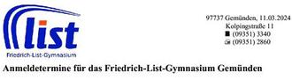 Die Anmeldung für die fünfte Klasse am Friedrich-List-Gymnasium Gemünden wird an folgenden Tagen im Sekretariat der Schule entgegengenommen: