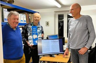 Strahlende Gesichter bei der Übergabe und Vorstellung der gesammelten Dorfgeschichte und -geschichten im Gemeindearchiv Gräfendorf. Von links nach rechts: Johannes Sitter, Gemeindearchivar Hans Georg Herch und Martin Deisenroth.