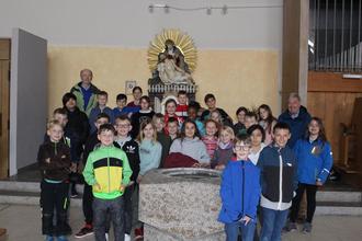 Auf Entdeckungen außerhalb des Klassenzimmers konnten sich die Schüler und Schülerinnen der Gräfendorfer Grundschule freuen. Im Rahmen des Heimat- und Sachunterrichts waren sie am Standort des ehemaligen katholischen Gotteshauses mit Herrn Johannes Sitter und Herrn Hans-Georg Herch verabredet. Gespannt betraten die Dritt- und Viertklässler mit ihrer Lehrerin Frau Wirthmann und einem angehenden Pädagogen die alte Schutzengelkirche hoch über Gräfendorf. Hier gab es so manche Spuren der Ausstattung zu entdecken, sei es die leeren Rahmen der Kreuzwegstationen, das Taufbecken oder die Kanzel, auf der der Pfarrer damals ohne Mikrofon der Gemeinde predigte. Beeindruckend waren auch die farbkräftigen Bilder an der Decke und die Engel am Chorbogen. Anhand eines alten Fotos zeigte Herr Sitter das frühere Aussehen des Kirchenraums und beantwortete Fragen der Kinder. Sehr anschaulich erzählte Herr Herch aus seiner eigenen Messdienerzeit. Welcher Körpereinsatz z. B. für das Läuten der Glocke und das Bedienen des Blasebalgs der Orgel gebraucht wurde, erfuhren die Schülerinnen und Schüler selbsttätig auf der Empore. Auch über die wundersame Rückkehr der größten Kirchenglocke wussten die Gräfendorfer Mitarbeiter des Archivs zu berichten. Vorsichtig stiegen die Schülerinnen und Schüler die von vielen Gläubigen ausgetretenen Stufen hinab zum Ausgang. Im Anschluss besuchten sie die neue Schutzengelkirche. Obgleich diese den meisten Schülerinnen und Schülern bekannt ist, sahen sie plötzlich Elemente wie die Pieta des Kriegerdenkmals bewusst und erkannten den Zusammenhang mit der alten Kirche. Ebenso wurde die namensgebende Schutzengelfigur, die Kreuzwegdarstellungen und andere Figuren aus der alten Kirche wiederentdeckt. Einige aktive Ministranten zeigten ihren Mitschülern und Mitschülerinnen noch Wissenswertes zu ihren heutigen Aufgaben – Blasebalg treten gehört allerdings nicht mehr dazu. Erfüllt mit vielen neuen Eindrücken, Geschichten und Bildern bedankten sich die Dritt- und Viertklässler bei den beiden engagierten Gräfendorfer Herren. So kann Geschichte lebendig werden.