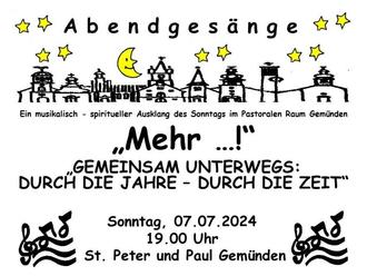 Band & Chor "Mehr...!" feiert am Sonntag, 07. Juli 2024 um 19.00 Uhr in der Stadtpfarrkirche St. Peter und Paul in Gemünden im Rahmen der "Abendgesänge" im Pastoralen Raum Gemünden das 30 - jährige Bestehen (seit 02.03.1991) nach. Unter dem Motto „Gemeinsam unterwegs: Durch die Jahre – durch die Zeit“ erklingen alte und neue Songs umrahmt von meditativen Texten.