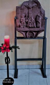 Die Aufnahme zeigt den Gedenkstein an das Pest Jahr 1673/74 in der Katholischen Schutzengelkirche in Gräfendorf. Foto: Johannes Sitter