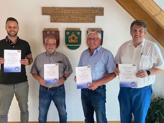 Die Sicherheit aller Informationen der Bürgerinnen und Bürger wird innerhalb der Verwaltungstätigkeit der Verwaltungsgemeinschaft Gemünden a. Main und mit ihren Mitgliedsgemeinden Gössenheim, Gräfendorf und Karsbach großgeschrieben. Ein wesentlicher Teil ist dabei die IT-Sicherheit, die der Verwaltungsgemeinschaft am 25.06.2024 sogar schriftlich bestätigt wurde. Seither trägt die Verwaltungsgemeinschaft Gemünden a.Main das Siegel „Kommunale IT-Sicherheit“, ausgegeben durch das Landesamt für Sicherheit in der Informationstechnik (LSI). Die Bürgermeister Herr Martin Göbel, Herr Klaus Schäfer, Herr Johannes Wagenpfahl sowie der Geschäftsstellenleiter Herr Johannes Schmelz nahmen die Siegelurkunde stellvertretend für ihre Mitgliedsgemeinden sowie für die Geschäftsstelle der Verwaltungsgemeinschaft Gemünden a. Main entgegen.