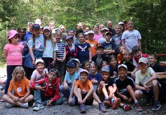 In der letzten Schulwoche durften die Grundschulkinder und ihre Lehrkräfte gemeinsam mit der Forstrevierleiterin Ramona Sailer und dem Forstrevierleiter Bastian Ehrenfels einen erlebnisreichen Tag im Gräfendorfer Gemeindewald verbringen. Am Morgen wurden die Schülerinnen und Schüler von den beiden Förstern und ihren beiden schwanzwedelnden jungen Hunden Paula und Rosi freudig in Empfang genommen. Gemeinsam machten sich alle an der Schondra entlang auf den Weg in den Gräfendorfer Wald. Dort warteten verschiedene „Challenges“ auf die Schulkinder, welche die Förster im Vorfeld schon vorbereitet hatten. Unter dem Themenschwerpunkt „Der Wald als Sauerstofflieferant“ spielten die Kinder unter anderem handlungsorientiert in einem Wettbewerb den Vorgang der Photosynthese nach. So transportierten die Schülerinnen und Schüler mit Schöpfkellen das Wasser von den Wurzeln eines aufgelegten Baumes in die Baumkronen. Dort wurde mit Hilfe von Sonnenlicht und Kohlendioxid Zucker (im Spiel symbolisiert durch Gummibärchen) und Sauerstoff produziert. Den Zucker brauchte der Baum zum Wachsen und einen Teil des Sauerstoffes wurde an unsere Luft abgegeben. Viele weitere interessante Dinge rund um den Wald durften die Schülerinnen und Schüler auf sehr kindgemäße Weise von den beiden Waldexperten an diesem Vormittag erfahren. Wir bestaunten unter anderem ein großes „Baumhotel für Tiere“, schätzten das Alter von Bäumen und lauschten den verschiedenen Vogelstimmen. Am Ende der Waldwanderung konnten sich alle mit leckeren Bratwürsten und kühlen Erfrischungsgetränken stärken. Der Waldtag, die Bewirtung und die verschiedenen Belohnungen (Schlüsselanhänger, Taschen, Schildkappen etc.) wurden von Gotthard Schwender und seiner Frau Sandra Schwender (u. a. Mitglieder des Vereins Waldarbeitermeisterschaften Deutschland) organisiert, unterstützt wurden sie hierbei von Martin und Iris Grosso. An diesem Tag strahlten wirklich alle freudig. Auch die Sonne lachte uns durch das dichte Blätterdach des Waldes sanft entgegen. Schön war’s. Ein herzliches Vergelt’s Gott an alle Beteiligten.