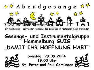 Unter diesem Motto gestaltet die Gesangs- und Instrumentalgruppe GuIG aus Hammelburg die Abendgesänge im Pastoralen Raum Gemünden am 29.9.2024 um 19 Uhr in der Kirche St. Peter und Paul in Gemünden.
