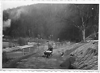 Hinweise: Die Daten sind dem Pressebericht des Gemündener Tageblatts vom 20. August 1955 entnommen. Frau Kathrin Spahn hat den Bericht unserem Archivteam überlassen. Die in Anführungszeichen gesetzten Texte sind wörtliche Zitate. Das Foto stammt um das Jahr 1957 herum. Es zeigt im Hintergrund die hölzerne Brücke über die Schondra und ein Arbeiter beim Ausbau des Weges.