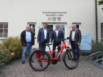 Gemünden. Am vergangenen Donnerstag, den 29.09.2022 wurde ein neues E-Bike von der Bayernwerk Netz GmbH an die Verwaltungsgemeinschaft Gemünden a. Main, stellvertretend an die Bürgermeister Johannes Wagenpfahl, Gräfendorf, Klaus Schäfer, Gössenheim, und Martin Göbel, Karsbach, übergeben. Das Elektrofahrrad ist eine Spende des regionalen Netzbetreibers. „Wir wollen damit in Kommunen umweltschonende Mobilität fördern und Lust machen aufs Rad“, meinte Frank Schneider, Kommunalbetreuer des größten regionalen Stromverteilnetzbetreibers Bayerns. E-Bikes sind die sportliche, emissionsfreie und vor allem trendige Alternative zum Auto, zumindest auf kürzeren Distanzen. In der Verwaltungsgemeinschaft Gemünden soll das E-Bike künftig für Dienstfahrten genutzt werden, ganz im Sinne des Mottos „Bayernwerk bewegt“. Der Gemeinschaftsvorsitzende Martin Göbel bedankt sich im Namen der drei Gemeinden und den Mitarbeiter/innen der Verwaltungsgemeinschaft Gemünden a. Main.