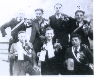 Auf dem Bild sind sie fröhlich und festlich geschmückt, und sie halten Bierkrüge in den Händen. Der Anlass für ihre Freude ist der "Tag der Musterung". Denn diese jungen Gräfendorfer sind allesamt im Jahr 1923 geboren. Doch diese Feierlichkeit hat einen ernsten Hintergrund.