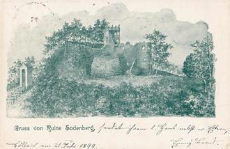 „Das enge Tal, umgeben von steilen, bewaldeten Bergen, gilt als eine der romantischsten Gegenden in Franken. Besonders malerisch ist es am Sodenberg, wo die Dörfer Weickersgrüben, Ochsenthal, Sodenberg und Neuzenbrunn liegen.“ So beschreibt Professor Dr. Josef Denzinger aus Würzburg 1846 das Rittergut und das Schloss auf dem Sodenberg und hebt dabei die Romantik der Region hervor. Diese Romantik könnte auch Emmy Brand inspiriert haben, am 21. Juli 1899 von ihrem Heimatort Höllrich zum Sodenberg zu wandern. Von diesem längeren Weg durch die Natur schickte sie eine Postkarte „an ihren lieben Freund Hans Hautsch nebst er Eltern“ nach Würzburg. Ob sie am Kreuz der Sodenberg-Kapelle ein kurzes Gebet sprach?