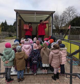 Stolze 105 gepackte Weihnachtsgeschenke wurden am vergangenen Freitag 29.11.2024 im Kindergarten Karsbach abgeholt. In den letzten Wochen wuchs der Stapel der bunt geschmückten Pakete im Eingangsbereich stetig, so dass wir dieses Jahr auf eine stolze Zahl von 105 Geschenkpaketen für Kinder in Not blicken konnten. Jeder der wollte konnte mit Hilfe der Anleitung ein persönliches Päckchen packen, unsere liebe Frau Palme aus Aschfeld spendet alleine 20 Geschenkpakete. Auch die Drogerie dm in Gemünden unterstützte uns mit Hygieneartikeln wie Shampoos und Duschgel, die die Pakete des Kindergartens ergänzten. Desweiteren gingen viele Geschenkkisten von Familien aus der Gemeinde ein. Ein riesengroßes Dankeschön - ihr bereitet 105 Kindern eine tolle Überraschung zu Weihnachten. Unsere tüchtigen Kindergarten Kinder schleppten die Geschenke selbständig zum bereitstehenden Lkw, von dort aus beginnen sie ihre weitere Reise. Frohe Weihnachten