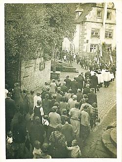 Das Originalfoto ist im Eigentum von Hans und Birgit Nowak. Sie haben das digitalisierte Bild dem Gemeindearchiv überlassen. Es wurde 1927 aufgenommen. Auf der Rückseite befindet sich der Vermerk: „Zum Andenken aus Gräfendorf am 17. August 1927“. Es handelt sich um das älteste bisher bekannte Foto aus Gräfendorf, aufgenommen aus einem Dachgaubenfenster des Anwesens mit der Hausnummer 8 oder 9. Nach Frau Doris Grimm aus Himmelstadt, der Autorin unserer ersten Gemeindechronik, handelt es sich um die Pfarreinführung von Pfarrer Peter Bauer am 17. August 1927.
