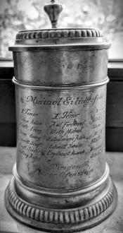 Dem lieben Vorstand widmete der Sängerverein einen Zinnkrug zum silbernen Hochzeitsfest, steht auf dem Deckel. Der liebe Vorstand war Bäckermeister Michael Friedrich Eilingsfeld (1861-1945). Er und seine Ehefrau Karolina geb. Krämer (1869-1948) feierten ihre Silberhochzeit am 2. März 1814. Mit dabei ihre sechs Kinder, Verwandte und Freunde. Den Festtag beging das Jubelpaar im Anwesen 44, heute noch bekannt als Bäckerei, Café-Pension Flury.