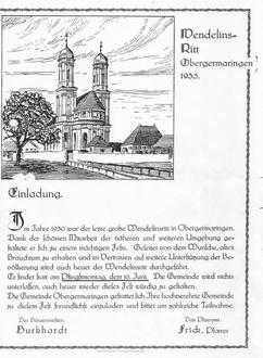 Von herrlichstem Wetter begünstigt hielt die Gemeinde Obergermaringen nach fünf Jahren den in der weiten Umgebung bekannten und beliebten „Wendelinsritt‘“ wieder ab. Der Zustrom von ca 10 000 Menschen erfolgte nicht zuletzt deshalb, da zu aller Freude bekannt wurde, dass der Schriftsteller Hochw. Herr Dr. Peter Dörfler als Festprediger gewonnen werden konnte. Auch Vater Erzabt von St. Ottilien hatte zugesagt und konnte im Freien ein von wohl noch Vielen nie gesehenes, herrliches Pontifikalamt abgehalten werden. Zur Verschönerung des Amtes trug im wesentlichen bei der sehr gute Gesang des Kirchenchores unter der Begleitung der bewährten Musikkapelle Eggenthal. Am Ritt beteiligten sich über 300 der schönsten Pferde von der weiteren Umgebung, die besonders stolz während der Segnung vorbei marschierten. Eingefügt dem langen Pferdetrupp waren die verschiedenen Musikkapellen und prächtigen Wagen, die besonders gefallen haben. Um diese Veranstaltung mit großem Erfolg möchte man Obergermaringen beneiden, ganz besonders deshalb auch, da es ihnen gelang Herren solchen Formates hiezu zu gewonnen. Die beliebten Landsleute konnten nicht nein sagen und sind wohl gerne beglückend in ihre Heimat gekommen. Solche Feste haben große Anziehungskraft und es hat sich gezeigt, daß Stadt und Land am alten Brauchtum zähe festhält.