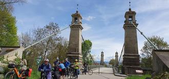 Die erste Mehrtages-Fahrradtour des ADFC Kaufbeuren-Ostallgäu Ende April/Anf. Mai führte die 8 Teilnehmer um Tourenleiterin Kordula Sengmüller durch 4 Welten: Pfänder-Bergwelt – Bodensee – Hochrhein - Schwarzwald. Nach der Anreise mit der Bahn nach Lindau ging es mit der Gondelbahn hinauf auf den Pfänder mit grandioser Sicht über den Bodensee und in die Vorarlberger und Schweizer Berge. Im Alpenwildpark konnten sogar Steinböcke bestaunt werden. Anschließend führte eine anspruchsvolle Abfahrt wieder hinunter zum Bodensee. Über Lindau und den Bodensee-Radweg mit Abstecher zur historischen Hängebrücke bei Langenargen wurde das sehr empfehlenswerte Quartier im Gasthof Rebstock in Stetten erreicht. Am nächsten Tag überquerte die Gruppe mit der Fähre den Bodensee nach Konstanz und radelte entlang des Hochrheins durch die Schweiz zur Pause in Stein am Rhein mit seinem beeindruckenden historischen Stadtkern. Der Höhepunkt dieses Tages waren die spektakulären Rheinfälle in Schaffhausen. Nach einem kurzen Aufenthalt folgte die Radlstrecke dem „Drei-Welten-Radweg“ ein Stück weiter über die Grenze ins Klettgau zur Übernachtung in Erzingen. Am 3. Tag ging es zunächst in die Rheinebene, danach in den Südschwarzwald in die Höhen bis auf 1.100 m. Übernachtet wurde in Bonndorf, wo die Gruppe den Japanischen Garten besichtigte. Am 4. Tag verlief der Radweg vormittags auf einer alten Bahntrasse über beeindruckende Viadukte hinein ins Naturschutzgebiet Wutachschlucht. Weiter ging es zum Titisee, wo die hervorragende Schwarzwälder Kirschtorte verköstigt werden konnte. Spektakulär anzuschauen war dann die Talbrücke Gutachtalbrücke, ein Kulturdenkmal nahe Titisee-Neustadt. In Bräunlingen durch das historische Stadttor war das Ziel der Reise Donaueschingen nicht mehr weit. Von dort erfolgte die Heimreise wieder mit der Bahn. Ein Teilnehmer war eigens aus dem Rheinland zu dieser Tour angereist und konnte, wie alle anderen, mit überwältigenden Eindrücken die Heimreise antreten.