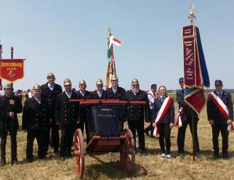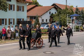 Bei hochsommerlichen Temperaturen machte sich die Fahnenabordnung und mehrere Kameraden der Freiwilligen Feuerwehr Ketterschwang auf den Weg. Mitgebracht hatte die Ketterschwanger Feuerwehr ihre restaurierte, historische Handspritze.