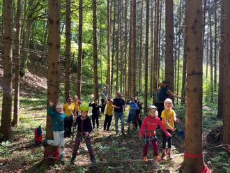 Am 10. Mai war unser Kletterhugo schon in den frühen Morgenstunden im Untergermaringer Wald. Dort baute er und sein Team über Stunden mehrere Kletter- und Flugelemente auf. Ab 11 Uhr ging es dann für die Georgifüchse hoch hinaus. Unter Teamarbeit zogen sie sich über 8 Meter in die Höhe, um dann im Klettergurt durch die Lüfte, wie ein Eichhörnchen zu fliegen. Mit dem Flying Fox flogen sie über Hecken und kleine Sträucher 15 Meter durch den Wald. Auch das aufgebaute Spinnennetz erforderte Geschicklichkeit und Teamgeist. Nach über 3 Stunden fliegen, ziehen, klettern und krabbeln schmeckte das mitgebrachte Picknick doppelt so gut.
