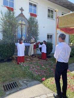 Traditionell waren die Altarstationen wieder sehr feierlich und blumenreich geschmückt. Fahnen säumten die Straßen und die Kinder streuten Blumen.