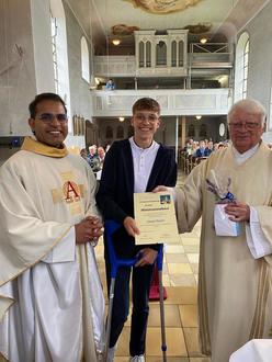 Bei diesem Festgottesdienst konnte Herr Kaplan Toms Abin unseren Oberministranten Samuel Bucher von seinem langjährigen, mit großer Zuverlässigkeit ausgeführtem Dienst verabschieden. Herr Kaplan Toms Abin überreichte an Samuel ein Geschenk verbunden mit Dankesworten und guten Wünschen für seine Zukunft.
