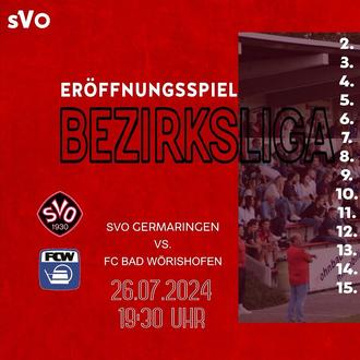 Das Eröffnungsspiel der Fußball-Bezirksliga Süd findet diesmal beim SVO Germaringen statt. Am Freitag, 26. Juli 2024 um 19.30 Uhr empfängt unser Team den Aufsteiger FC Bad Wörishofen. „Bei schöner Witterung erwarte ich bis zu 1.000 Zuschauer, denn auch die restlichen Bezirksliga-Vereine sind zu dieser Veranstaltung stets eingeladen“, so die Vorfreude bei Ressortleiter Oliver Baumann. Entsprechend laufen auch schon die Vorbereitungen dazu auf Hochtouren. „Es wird ab 19 Uhr ein Rahmenprogramm mit der Vorstellung aller Bezirksliga-Teams geben. In der Halbzeitpause ist ein Elfmeter-Schießen, sowie ein kurzes Spiel unserer Bambini-Mannschaft geplant. Im Anschluss an die Partie gibt es von beiden Trainern noch die Stimmen zum Spiel. Natürlich haben wir auch für ausreichend Bewirtung im Stadion gesorgt“, berichtet Baumann von den Planungen.