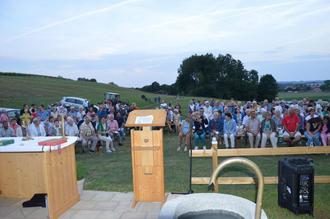 „Die Vielfalt des Lebens ist großartig“ appellierte Pfarrer Anton Siegel beim Feldgottesdienst, den das katholische Landvolk an einem Sommerabend veranstaltete. „Immer wieder neu anfangen dürfen, auf das Leben achten und Weizen über das Unkraut unseres Lebens wachsen lassen“ war die Botschaft des Landvolk-Pfarrers aus Bobingen. Der Einladung zur neuen Kapelle Maria im Hart folgten rund 200 Besucher aus Germaringen und Umgebung. Der Gottesdienst wurde vom Musikverein Germaringen sehr stimmungsvoll umrahmt. Neue geistliche Lieder und Gesänge aus der Schubert-Messe klangen von der Anhöhe der Kapelle bei Obergermaringen. Diese Lieder haben alle den Menschen im Blick und untermalten den schönen Sommerabend und die gute Gemeinschaft auf der Anhöhe mit Blick in die Abendsonne. Im Anschluss konnten die Gäste bei einer kleinen Bewirtung durch Germaringer Jugendliche und Blasmusik das Wochenende ausklingen lassen und das Feuerwerk des Tänzelfestes bestaunen. Die Veranstalter freuten sich, dass mit der Kapelle durch die Familie Barnsteiner ein neues Glaubenszeugnis an einem besonderen Ort geschafffen wurde.