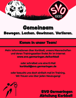 Dann melde dich unter korbball@svo.germaringen.de oder komme direkt zu einem unverbindlichen Schnuppertraining vorbei.