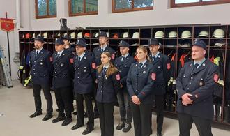 vorne links: KBI Georg Trautwein, Lena Ledermann, Gruppenführer Sebastian Kögel, Julia Ledermann, Florian Ledermann, Kommandant Hubert Zingerle
