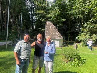 Bei Ihrem Ausflug zur Creszentia Kapelle nach Dienhausen durften die Teilnehmer der Wanderung einen Vortrag von Mattäus Unsin erleben. Herr Unsin hat begeistert von der Heilung seines Sohnes erzählt, weshalb er zum Dank die Creszentiakapelle baute. Das wiederum animierte die Wandergruppe dazu spontan Spenden zu sammeln um bedürftigen Kindern zu helfen (ein weiteres Projekt von Hr. Unsin). Auf dem Foto neben Hr. Unsin die beiden Leiter der Wandergruppe Josef Währinger und Irmgard Hagg bei der Übergabe der Spende.