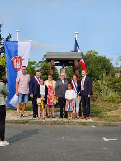 Auf dem Platz vor dem Saal Henri-Victor Mallard hatten die Franzosen alles gerichtet für die offiziellen Reden der Bürgermeister Fruchet und Bucher und der beiden Komitee Vorsitzenden Elke Metschar und Yannik Guilloteau. Hier wurden auch die Geschenke an das französische Komitee übergeben. Elke Metschar wies in ihrer Rede daraufhin, dass dieser Besuch ein Jubiläum beinhalte, denn vor genau 30 Jahren war die offizielle Partnerschaft zwischen, damals noch La Verrie, und Germaringen hier in Chanverrie besiegelt worden und auch die Freundschaftsglocke wurde 1994 zum ersten Mal geläutet. Die Glocke war das damalige Geschenk der Gemeinde Germaringen an ihre nun offizielle Partnergemeinde La Verrie.