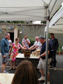 In der Zwischenzeit liefen bereits die Vorbereitungen für das große Sonntagmittag-Essen mit dem Grillen zweier Spanferkel, die sich alle deutschen und französischen Freunde nach dem traditionellen Freundschaftsglas schmecken ließen. Dazu wurde auch eines der mitgebrachten Bierfässer der Aktienbrauerei Kaufbeuren angezapft. Der weitere Nachmittag verging mit verschiedenen Spielen, bevor es zum Abendessen zurück in die Gastfamilien ging.