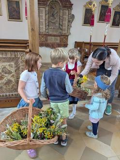 Die Kinder sind mit Eifer beim Kräuterboschenbinden dabei.